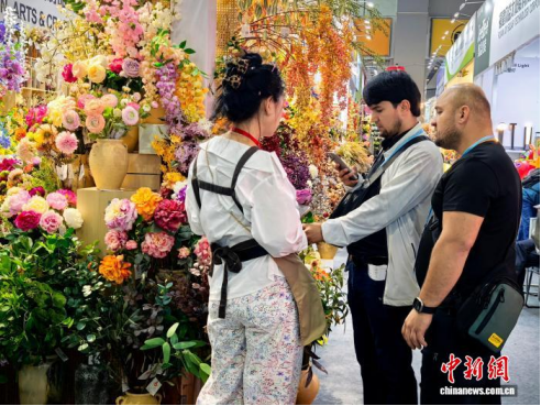 “这款花触摸上去像真的一样,是用什么材料做的?”在东莞市竟成工艺制品科技有限公司展位上,印尼采购商安通一边用卷尺测量花枝长度,一边了解产品细节。
