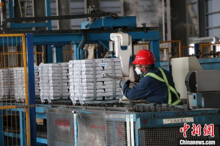 在其生产车间内,多台智能生产设备有序运转,几名工人不时关注着操作台的数据,并对成品锌锭进行严格质检。