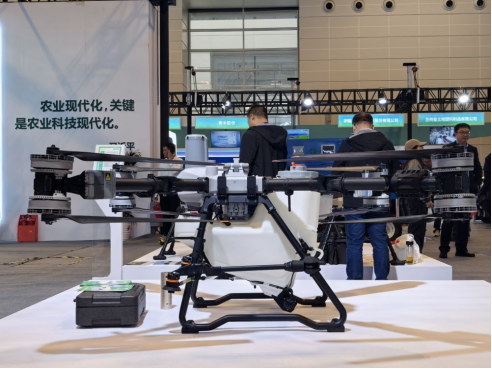 深圳市大疆创新科技有限公司在展会上展出的T100农业无人飞机。